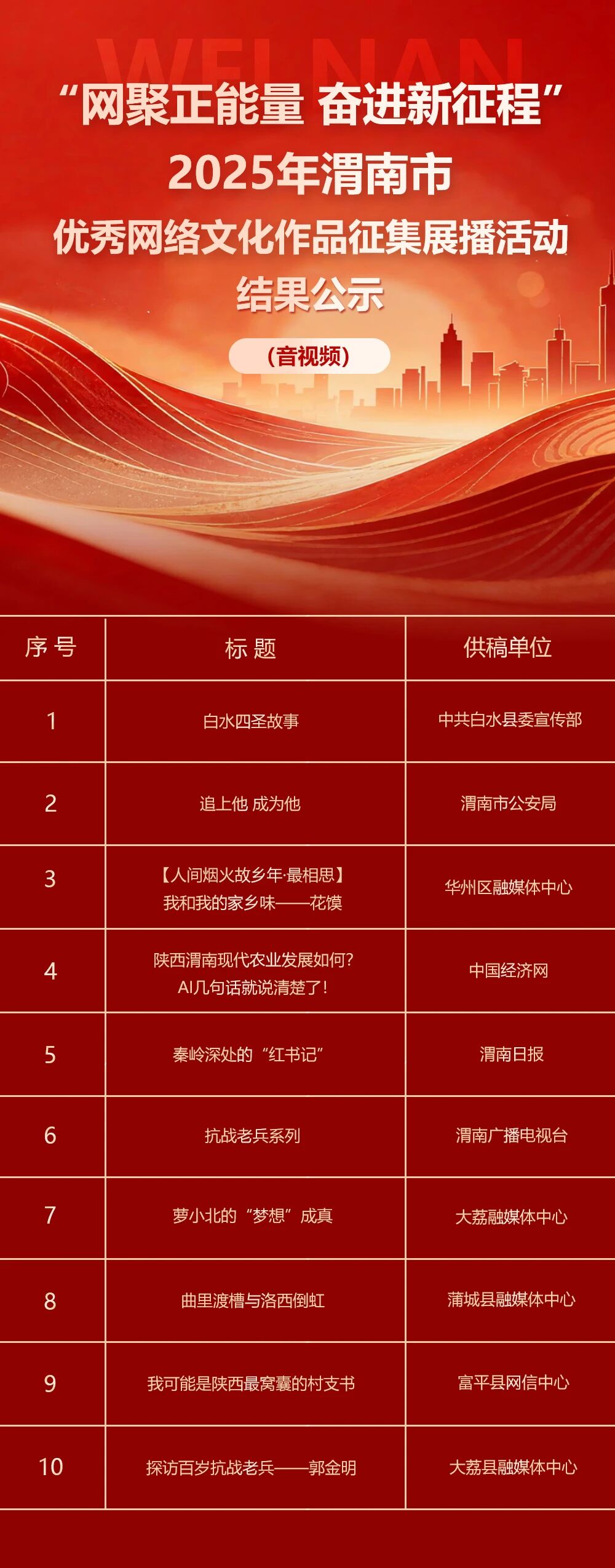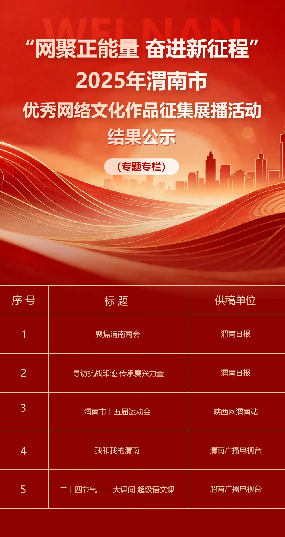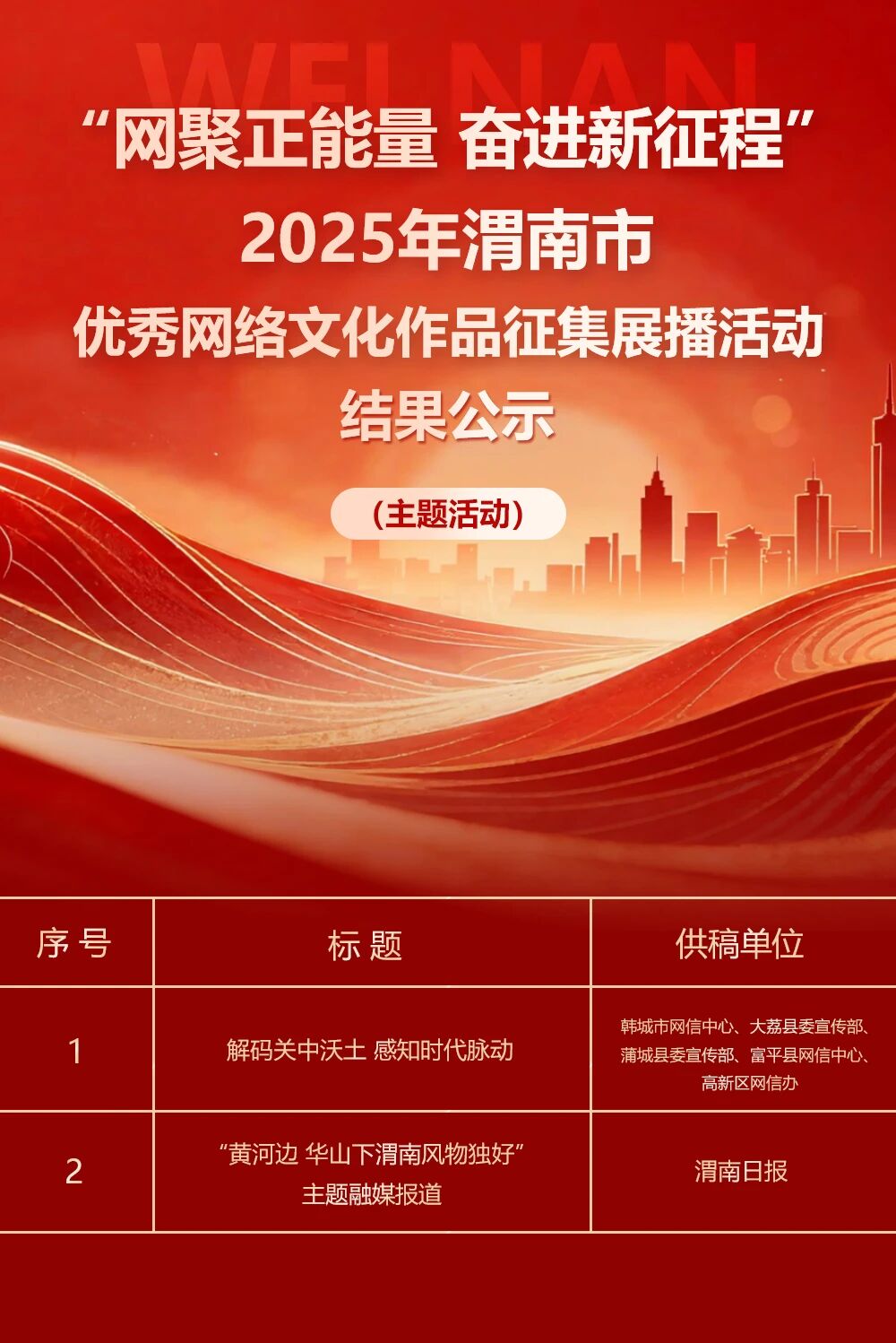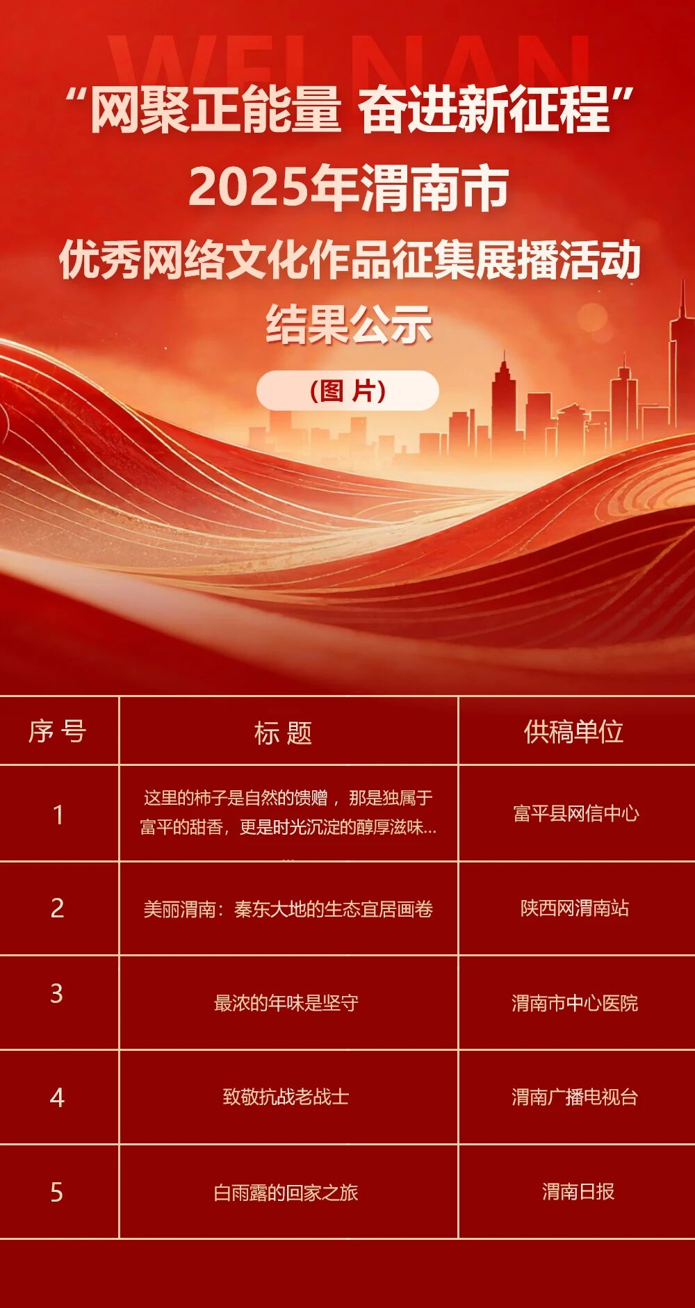 “网聚正能量 奋进新征程” 2025年渭南市优秀网络文化作品征集展播活动,经公开征集、专家评审等环节,27件优秀网络文化作品脱颖而出。
